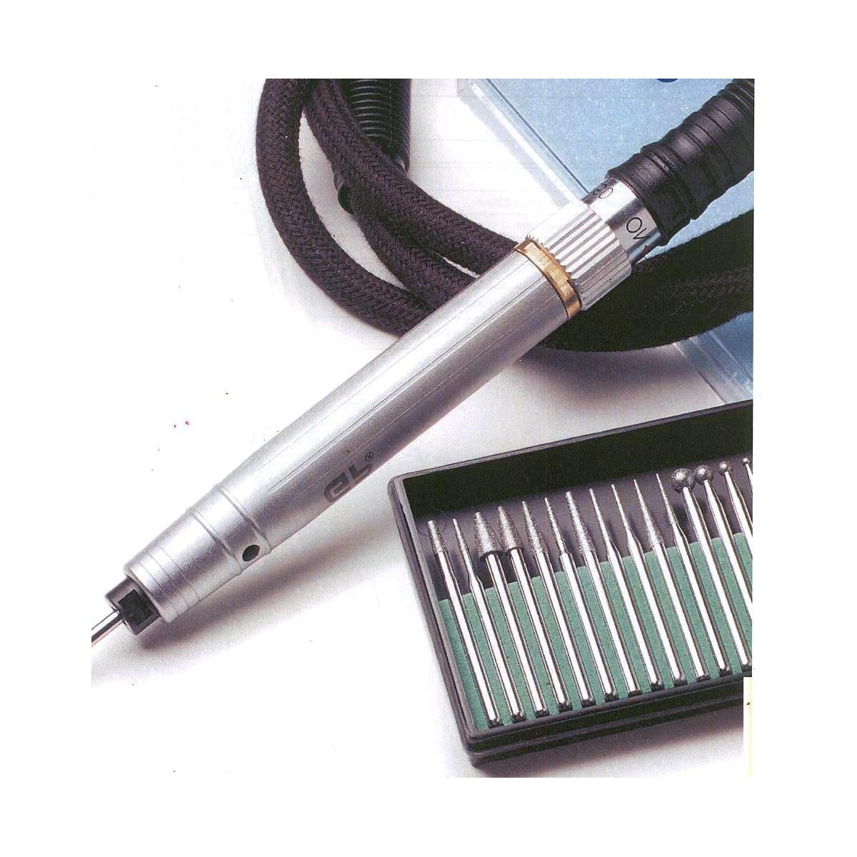 Micromeuleuse pneumatique à pince de 3 pour travaux de gravure ou de sculpture avec disques ou fraises diamantés, vitesse de rotation 60.000 Tours/minute, consommation d'air 180 litres/minute, poids 180 grammes.